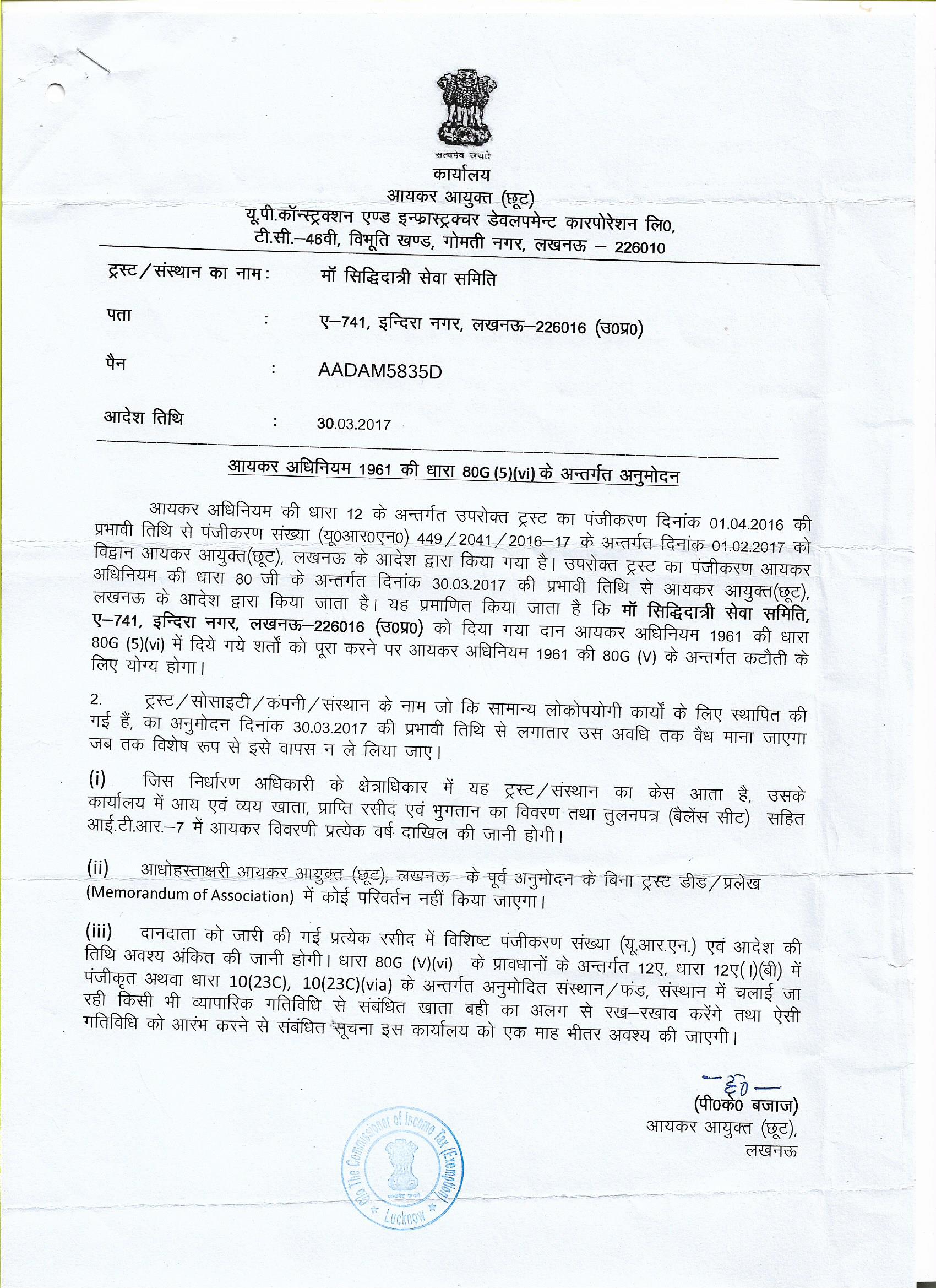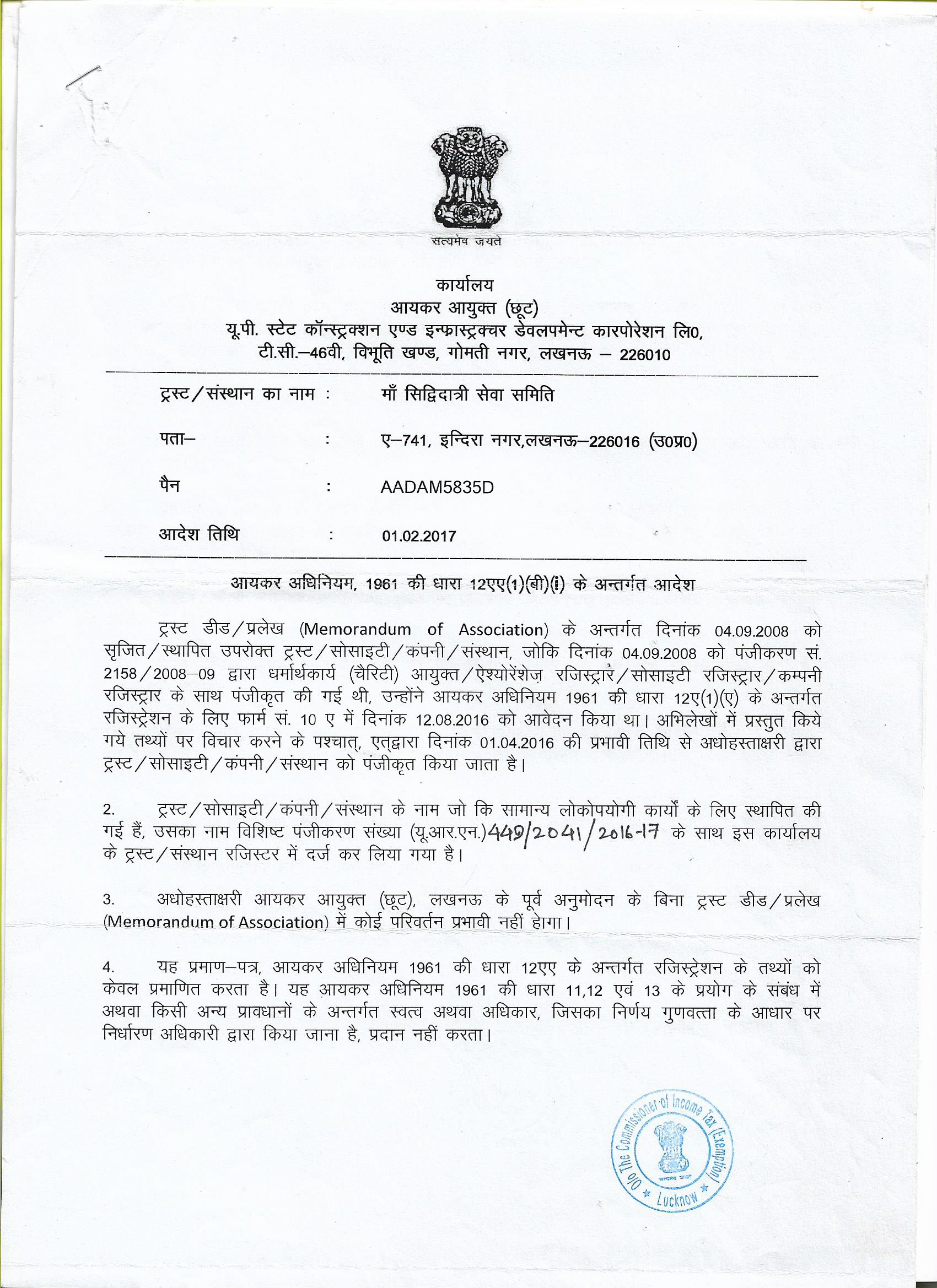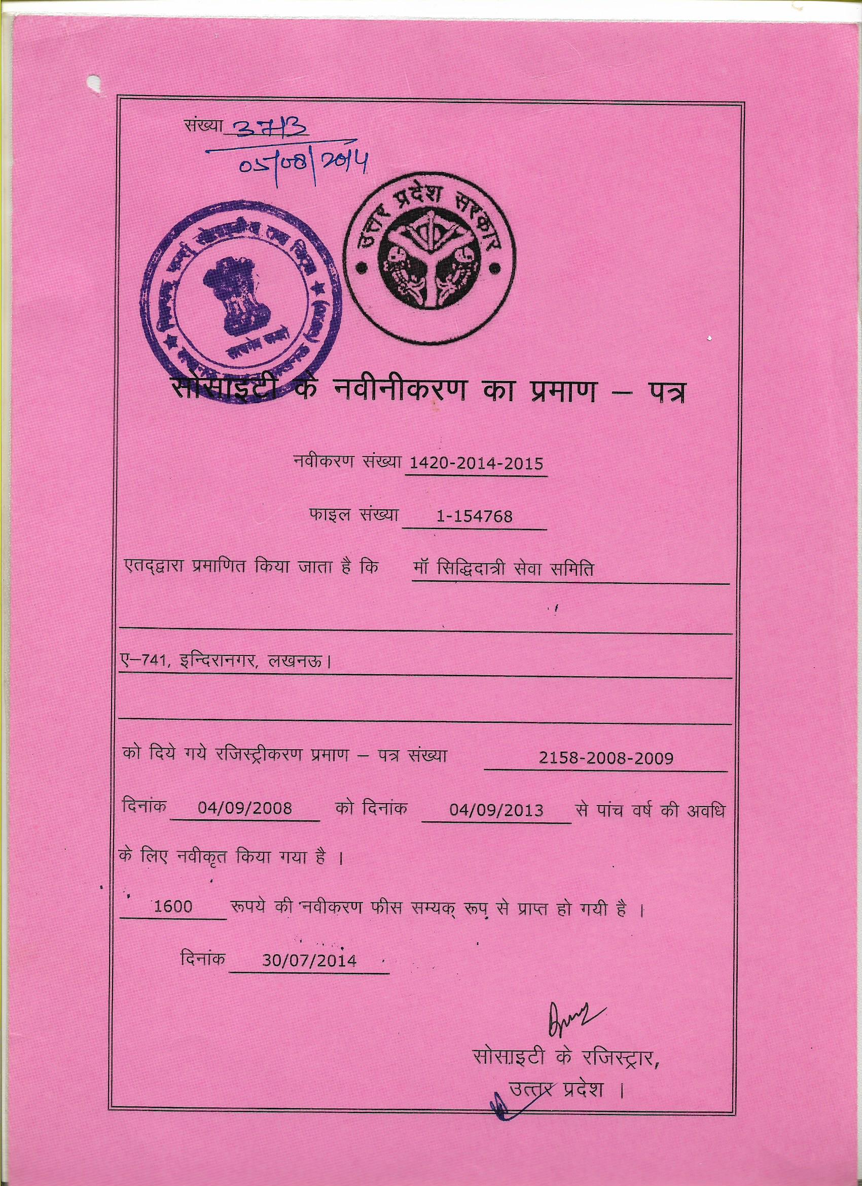 Legal Accreditations possessed by Maa Siddhidatri Seva Samiti